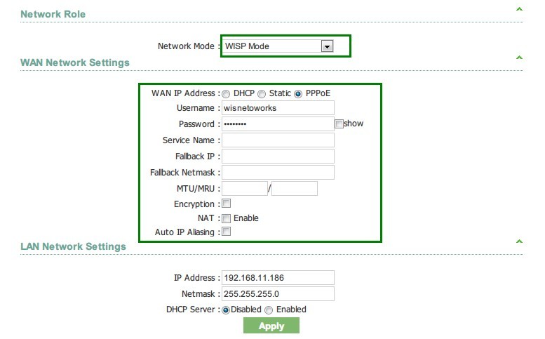 2. Go to Network page, choose WISP mode, and fill in the information provided by your WISP.