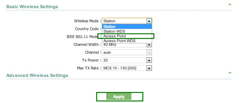 1. After login the web interface, go to Radio page, choose Access Point Mode, and press Apply
