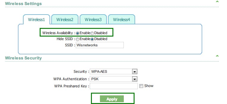 2. Go to Wireless page, choose Enable at Wireless Availability , and press Apply & Save after finishing the SSID and encryption settings.